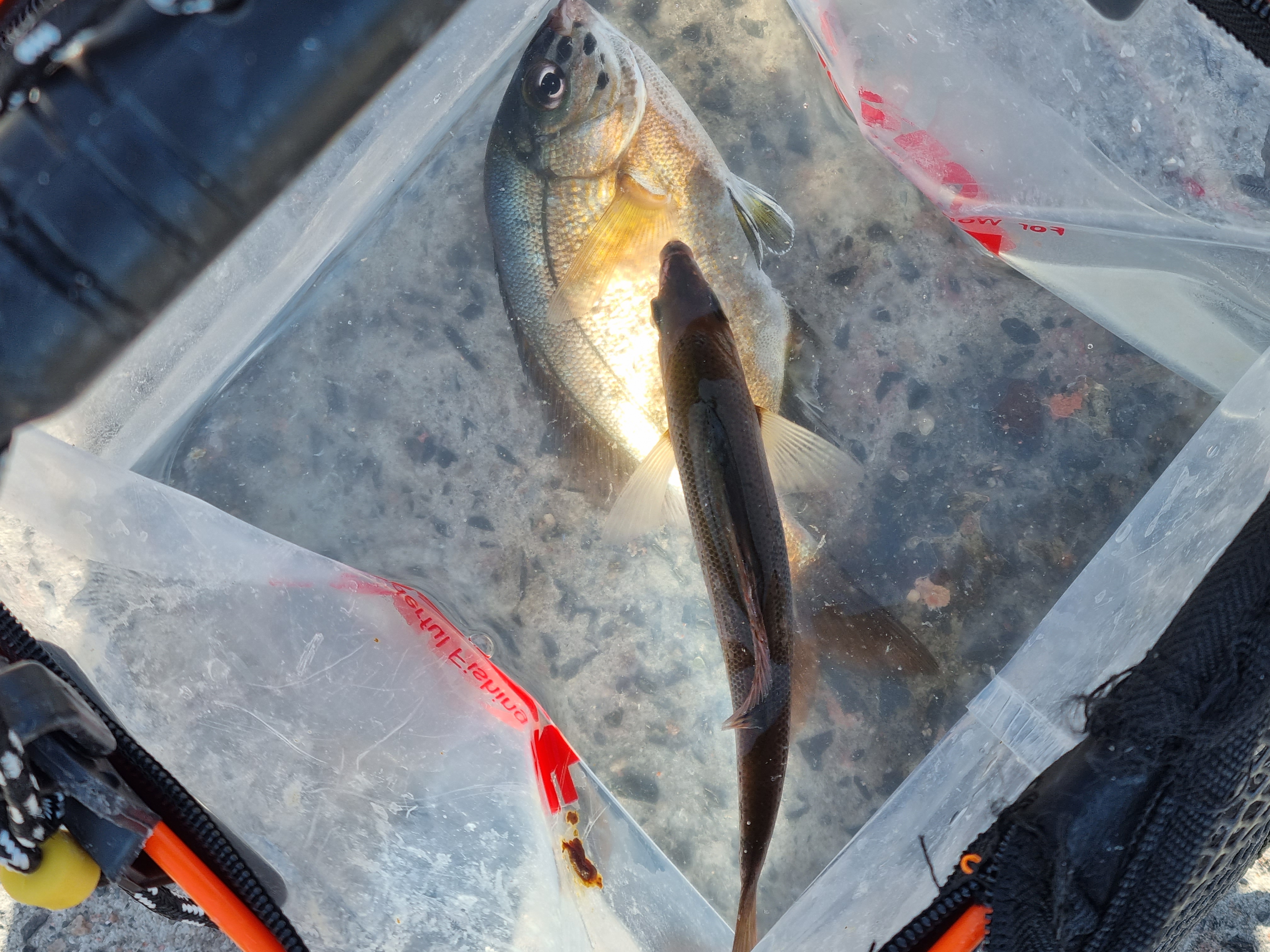 첫 캐스팅에 망상어 한 마리를 잡고, 제가 쏨뱅이 새끼를 잡아 바닥에 놓고 사진을 찍으려는데