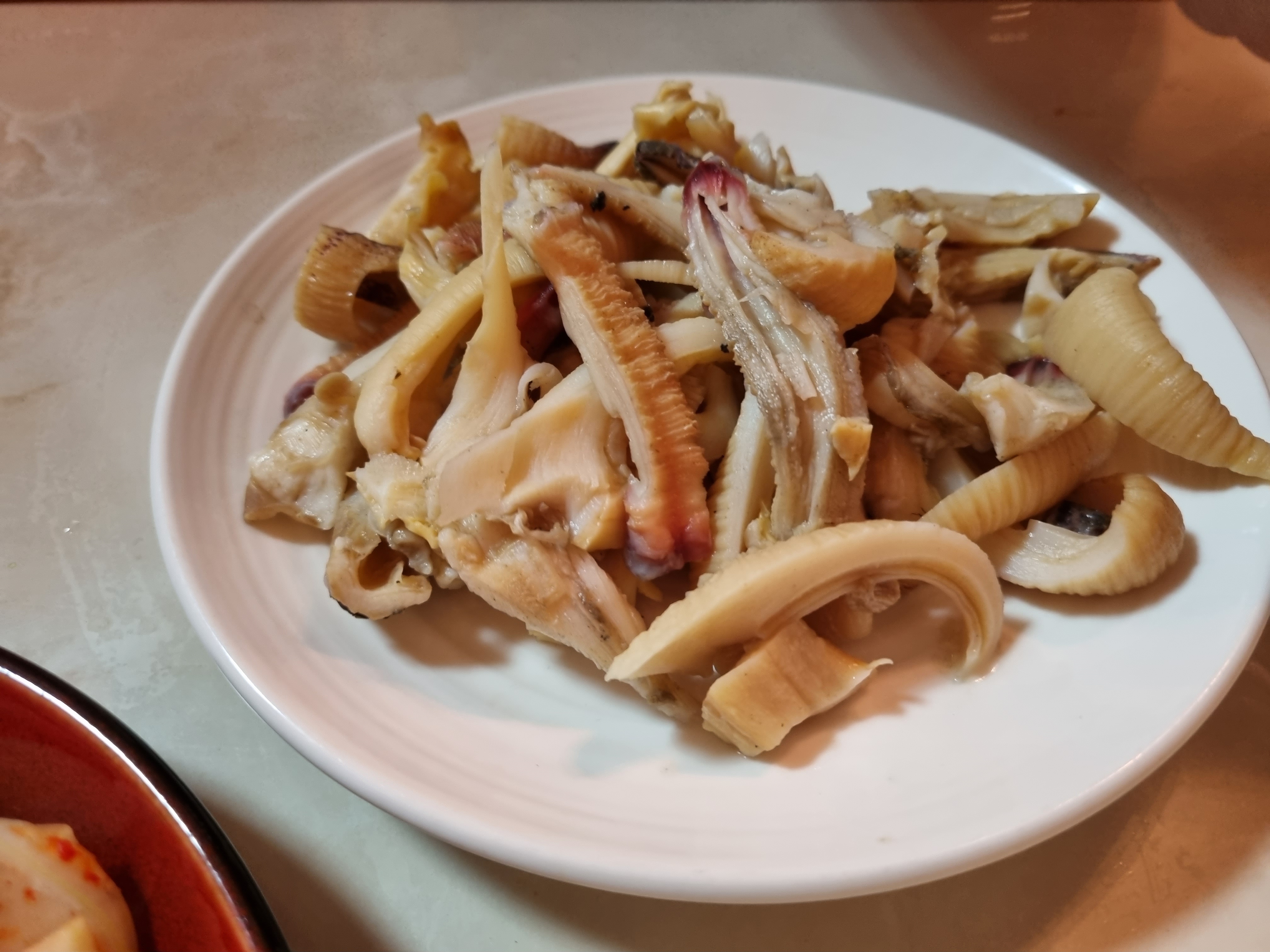 코끼리조개와 왕우럭조개는 2분간 데쳐서 껍질 벗겨 대강 썰었습니다.