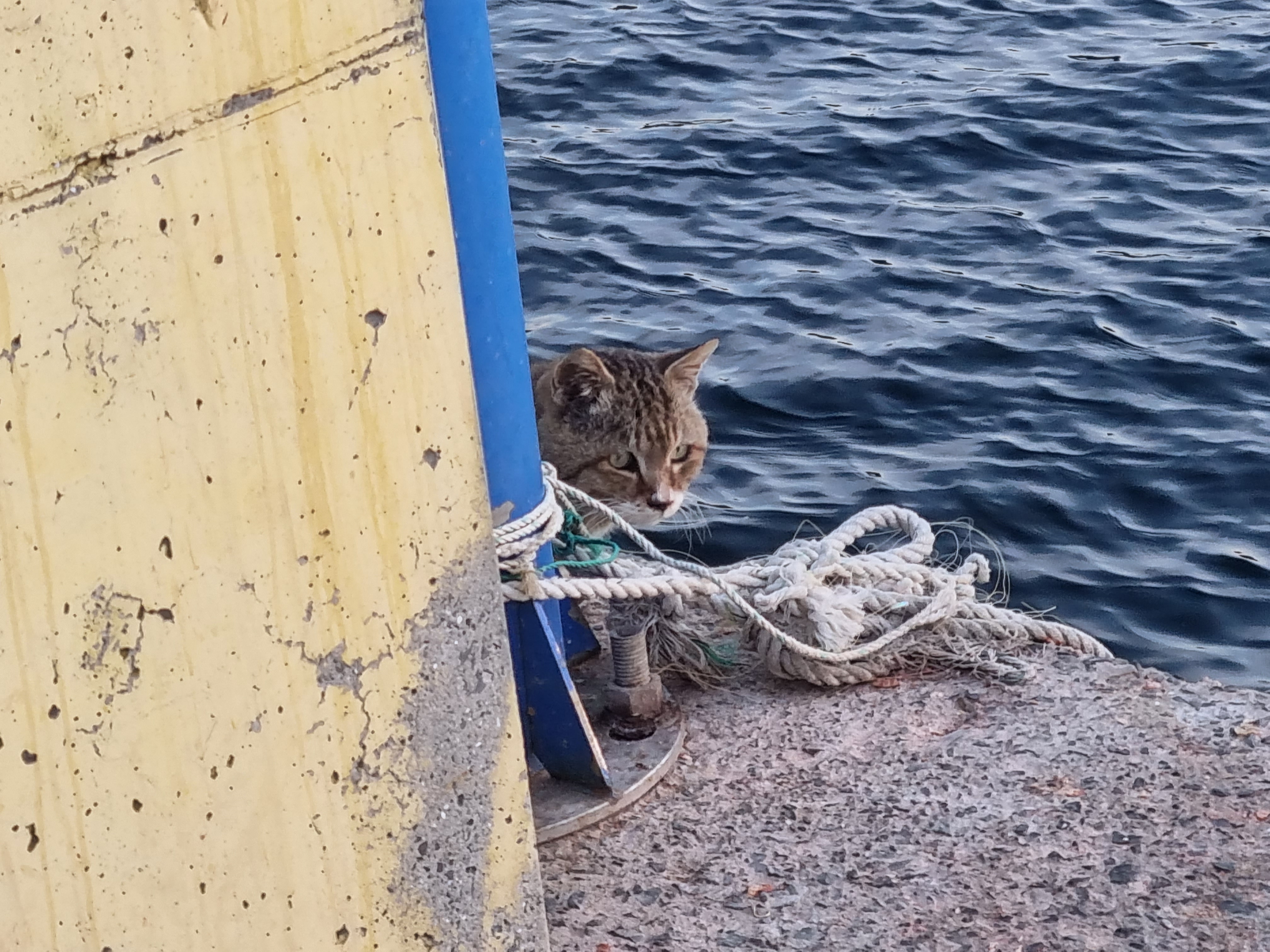 방파제 끝에 오니 큰 고양이 한 마리가 도망을 갑니다. 저 뒤로 도망을 갔습니다.